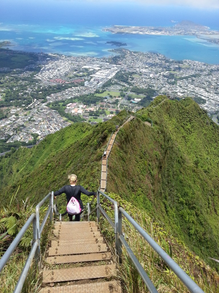 Tripler Ridge to Haiku Stairs 68 Published August 5, 2013 at 2448 × 3264 in Tripler Ridge to Haiku Stairs Bailey heading down the stairs.