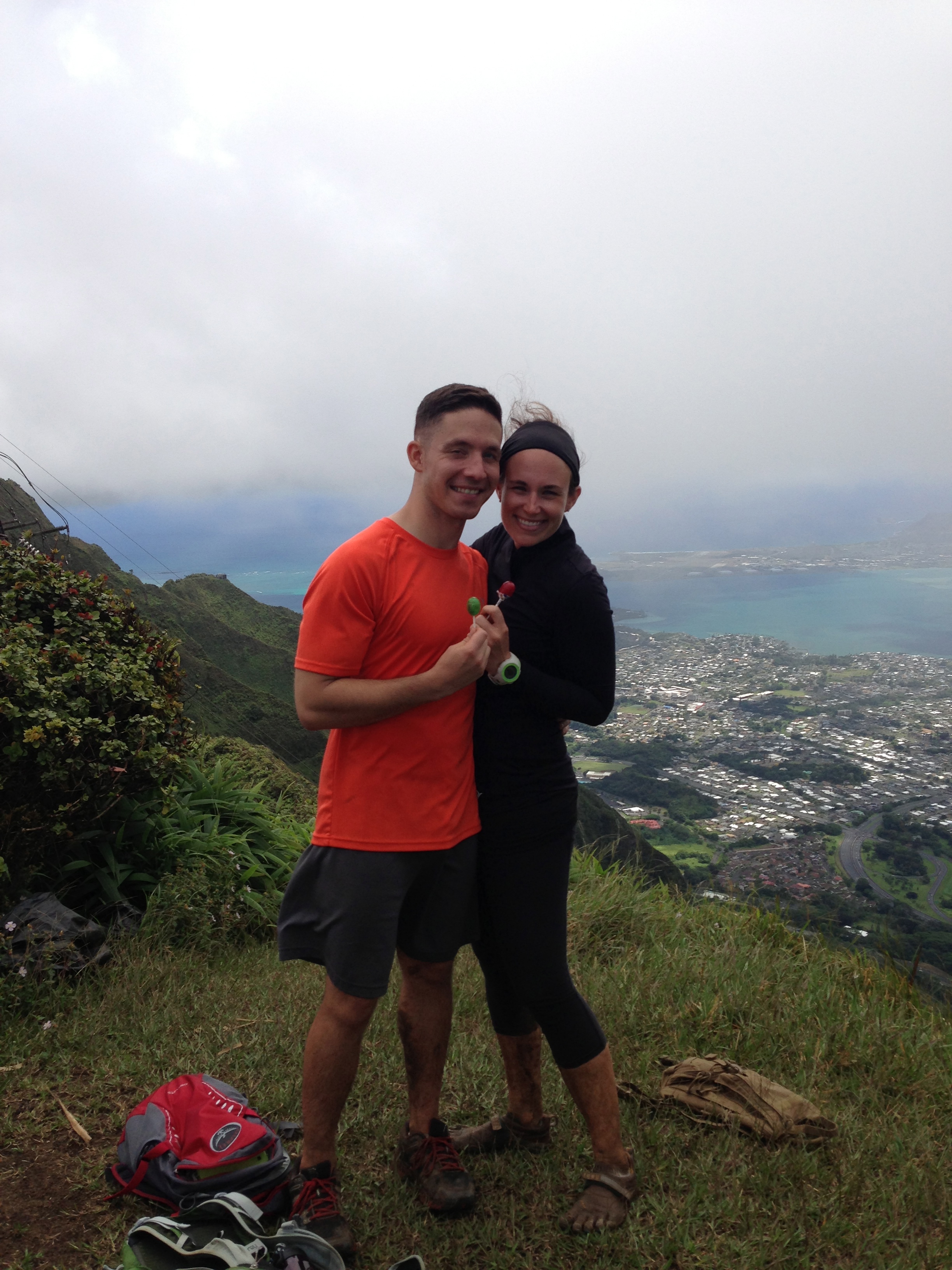 Tripler Ridge to Haiku Stairs 47 Published August 5, 2013 at 2448 × 3264 in Tripler Ridge to Haiku Stairs Josh and I holding our blow pops that Bailey provided for all of us!