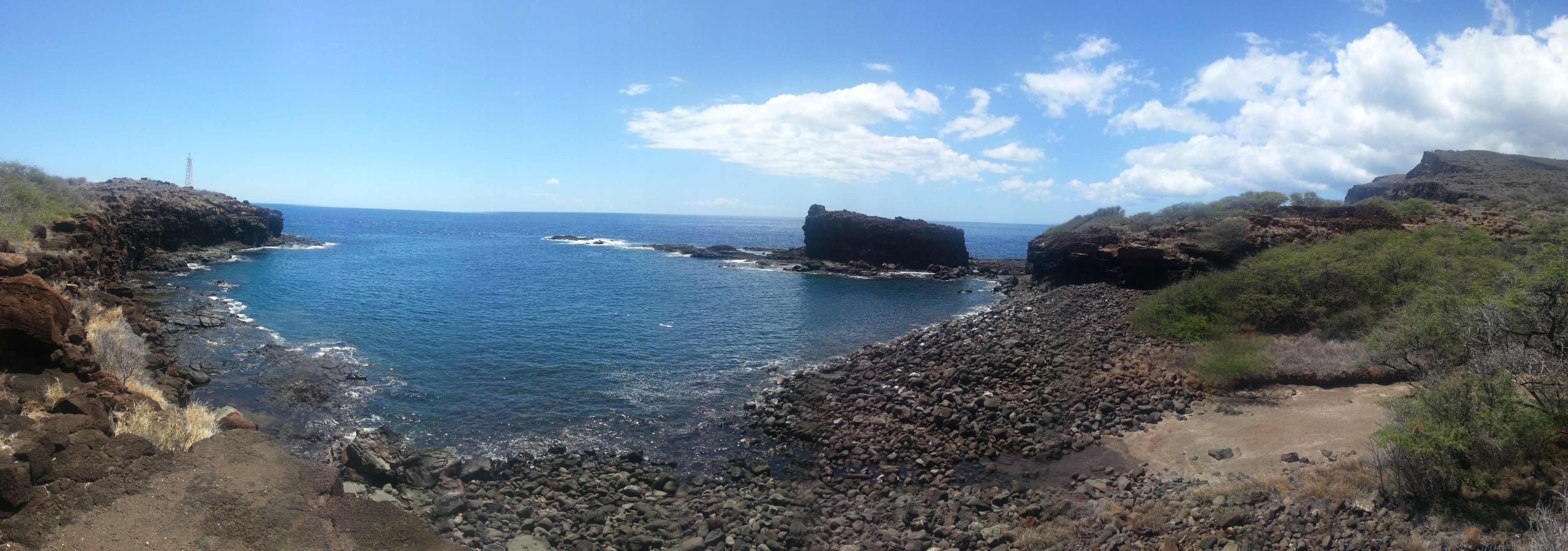 Kaunolu Village 3 Published September 3, 2013 at 4096 × 1440 in Lanai: Day 1 Panoramic of the shore and Kaneapu Rock.