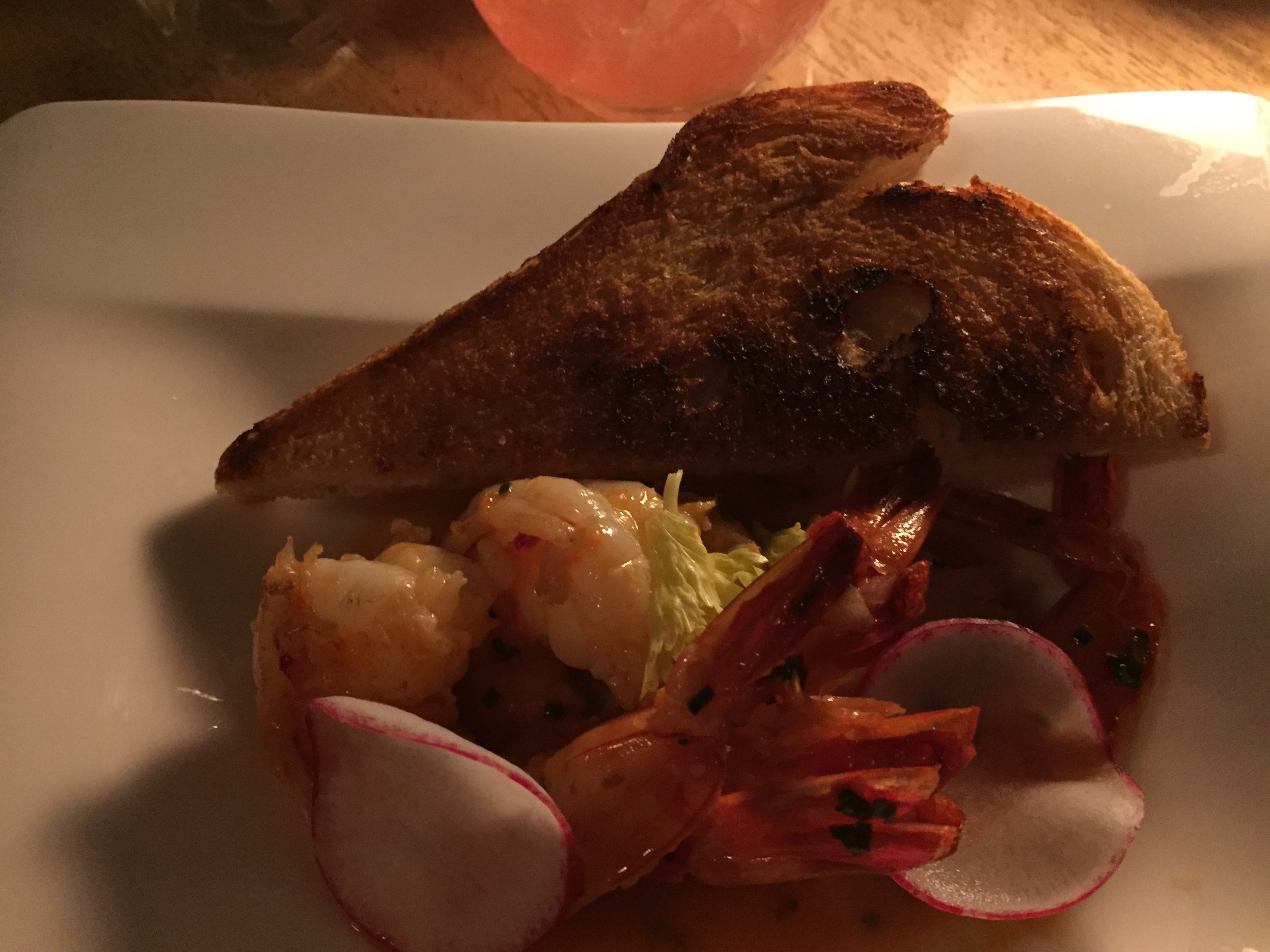 IMG_3963 Published May 28, 2018 at 3264 × 2448 in Lanai: Trip 2 – Day 1 Catalan Shrimp – Meyer Lemon, Tarragon, Lime, Saffron White Wine Broth, Grilled Garlic Bread
