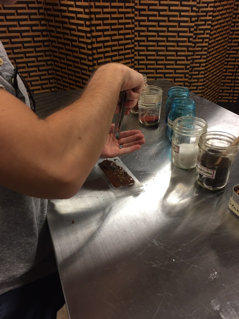 IMG_4369 Published July 15, 2018 at 2448 × 3264 in Madre Chocolate Josh adding coffee, cinnamon, and salt to his chocolate.