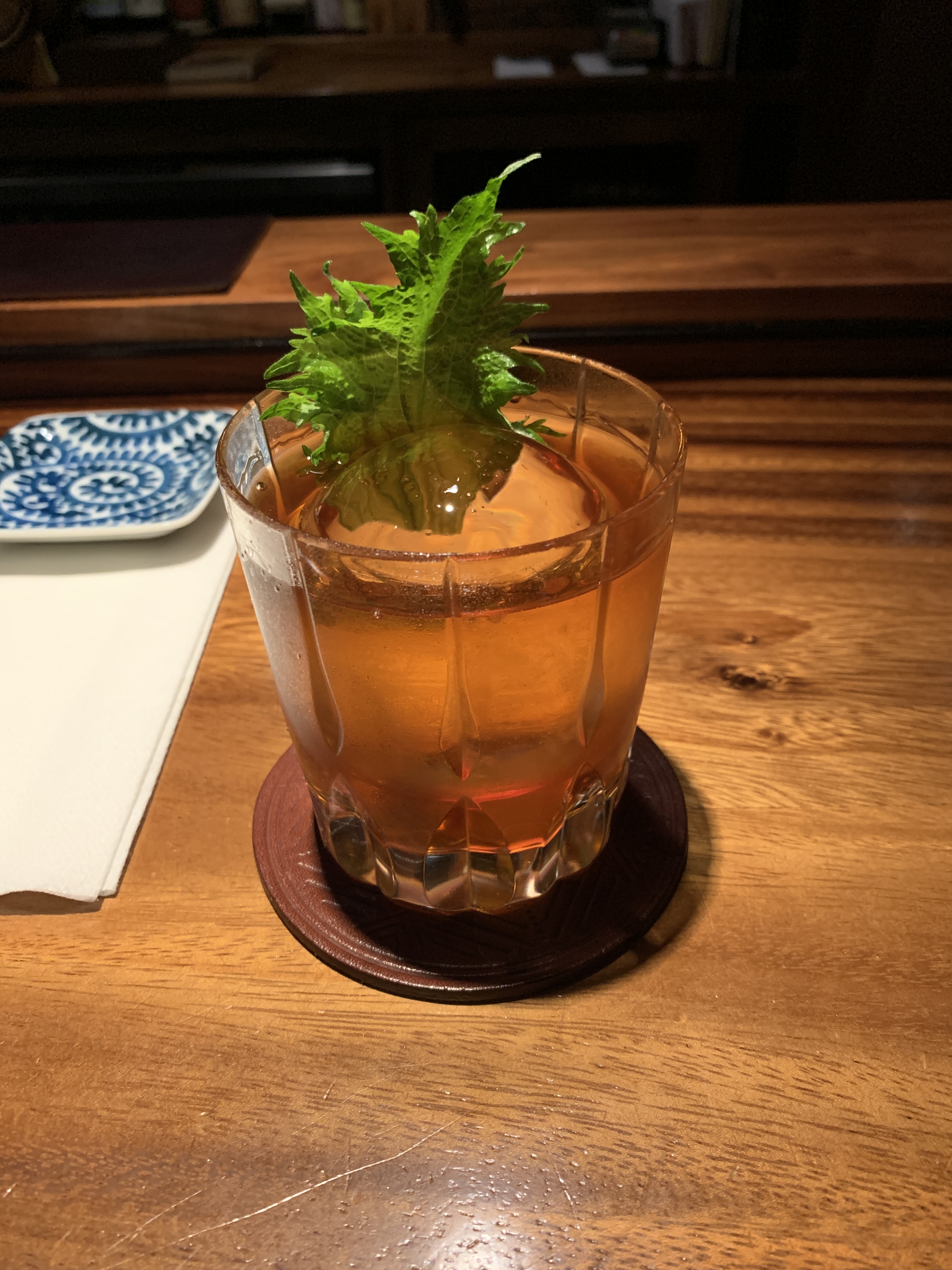 IMG_6121 Published April 25, 2019 at 3024 × 4032 in Bar Leather Apron Imperial Old Fashioned: Suntory Toki, Hakushu 12 year, Wasanbon Sugar, Angostura Bitters, Lilikoi, Shiso Essence